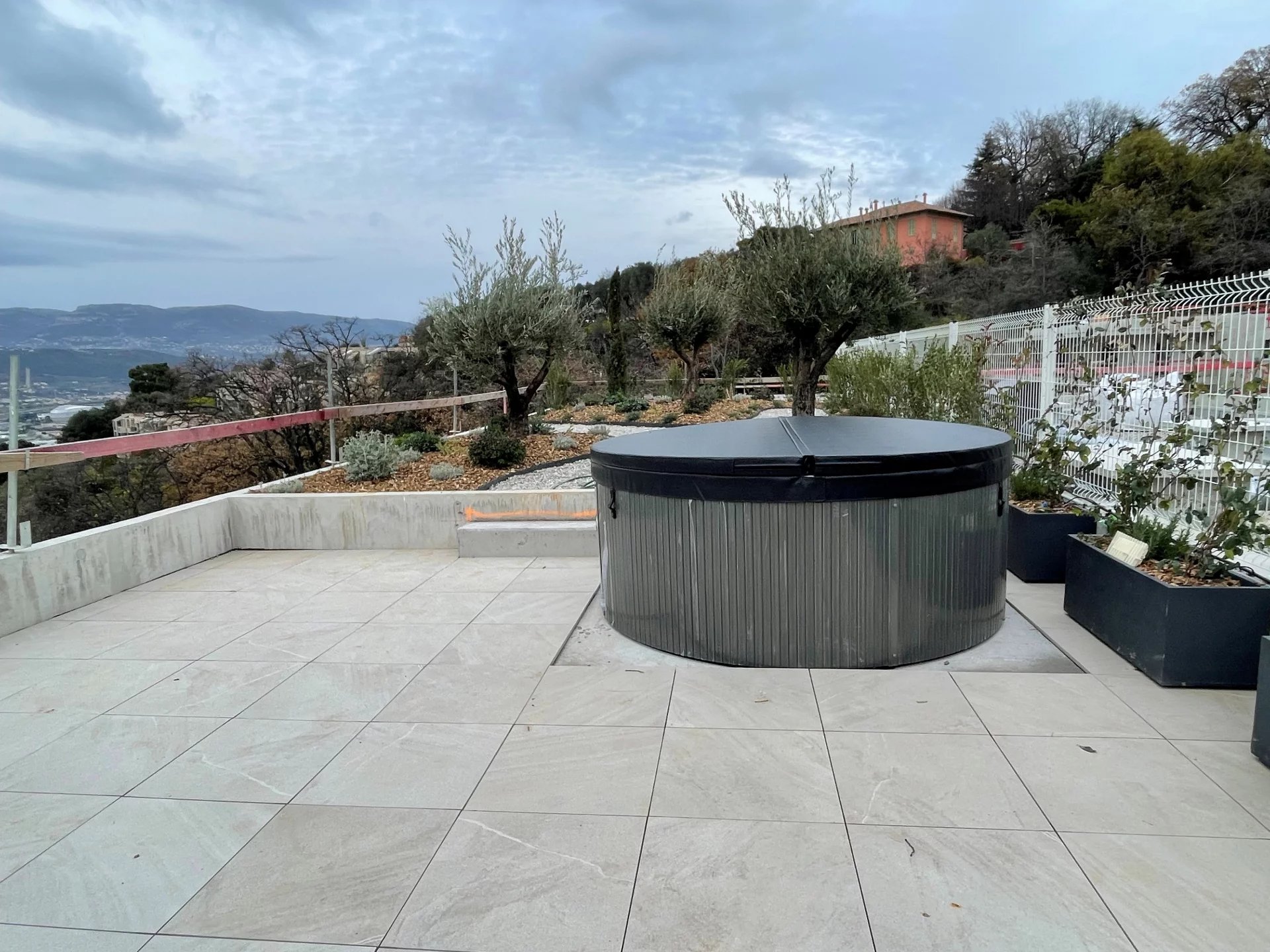 Référence 86666054 • EXCEPTIONNEL! Magnifique 5 Pièces de 114 m2 . 4 chambres. 3 bains ou douche. Cuisine équipée. Terrasse Sud et Ouest de 43 m2. Par un escalier extérieur on accède à toit terrasse de 118 m2 comprenant une terrasse avec jacuzzi et un jardin complanté d'oliviers. 2 parkings sous-sol. Calme absolu. FRAIS REDUITS
