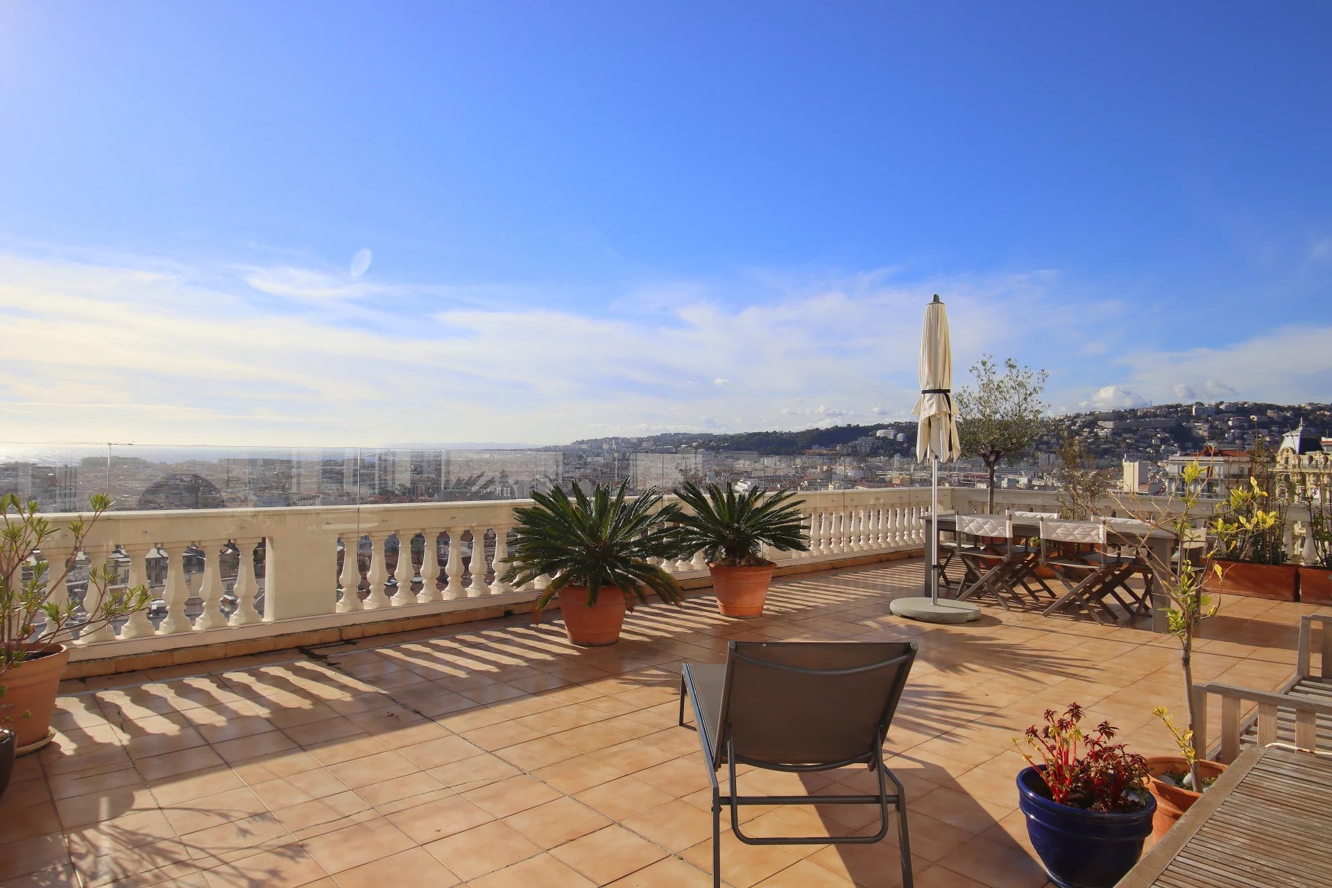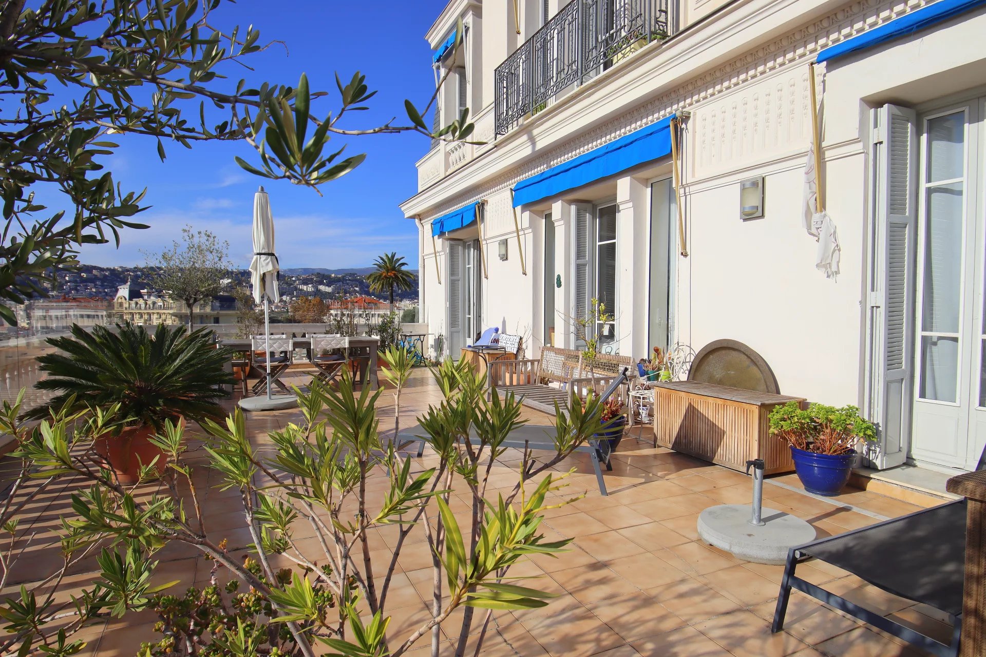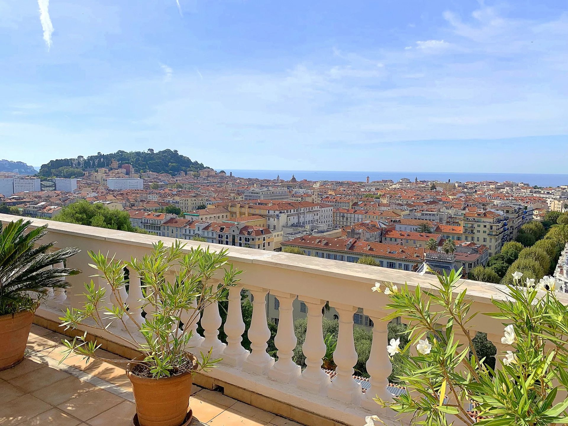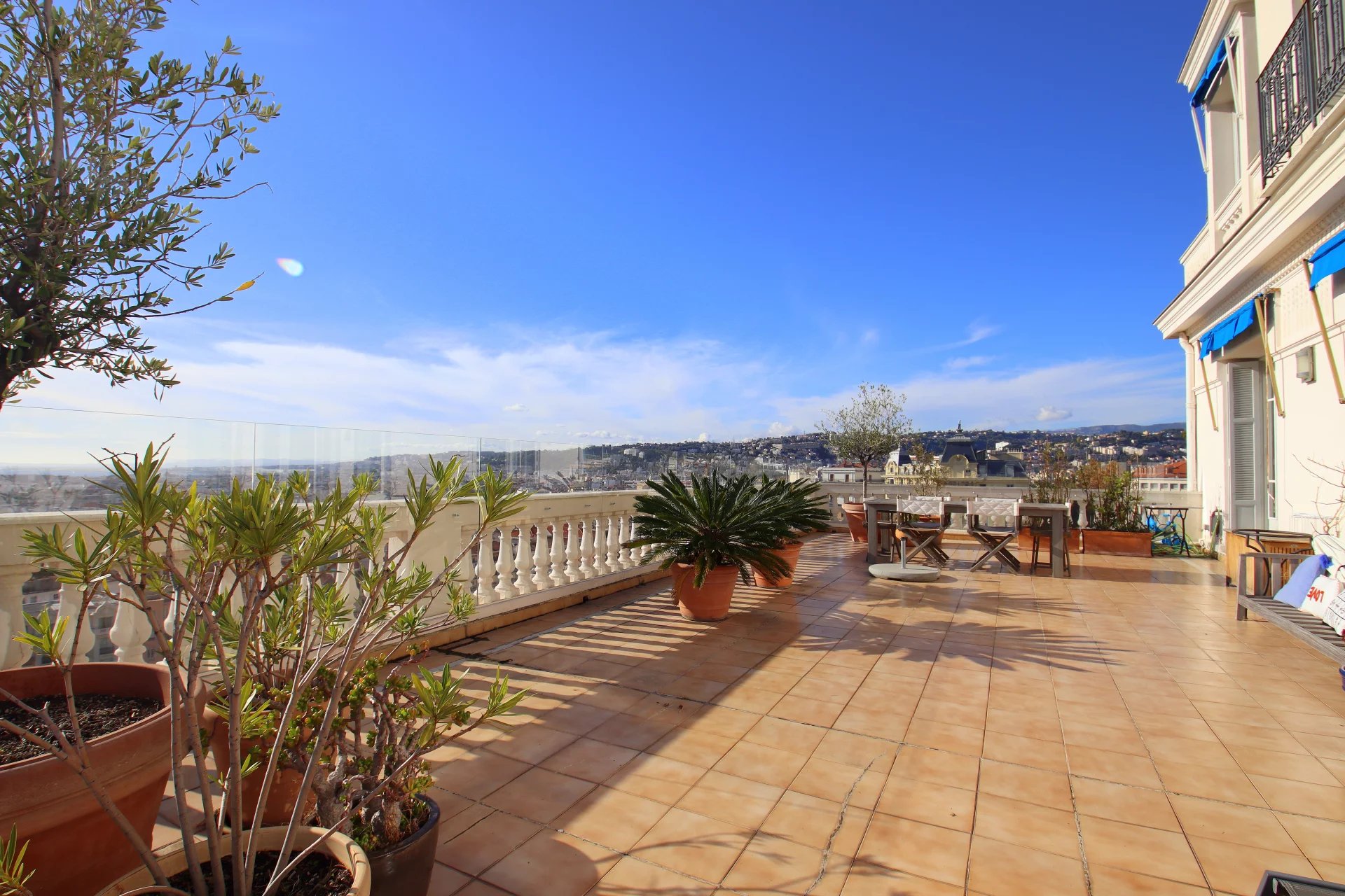 Dans une superbe villa de style " Belle Epoque". Exceptionnel 3 pièces de 97 m² bénéficiant d'une vaste terrasse de 80 m², plein Sud face à une vue spectaculaire ville et mer jusqu'au Cap d'Antibes. L'appartement se compose d'une vaste réception de 50 m² avec cuisine américaine équipée. Une suite parentale avec douche à l'italienne et dressing, une seconde chambre avec sa salle de bains.