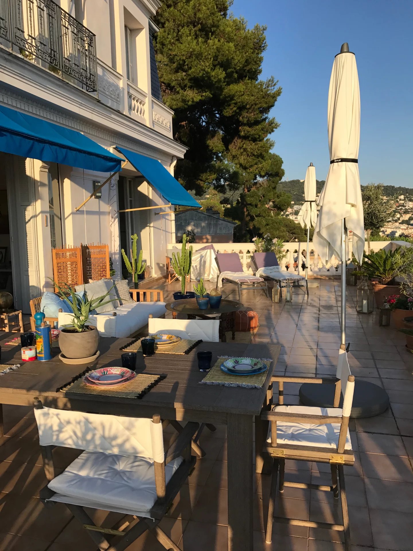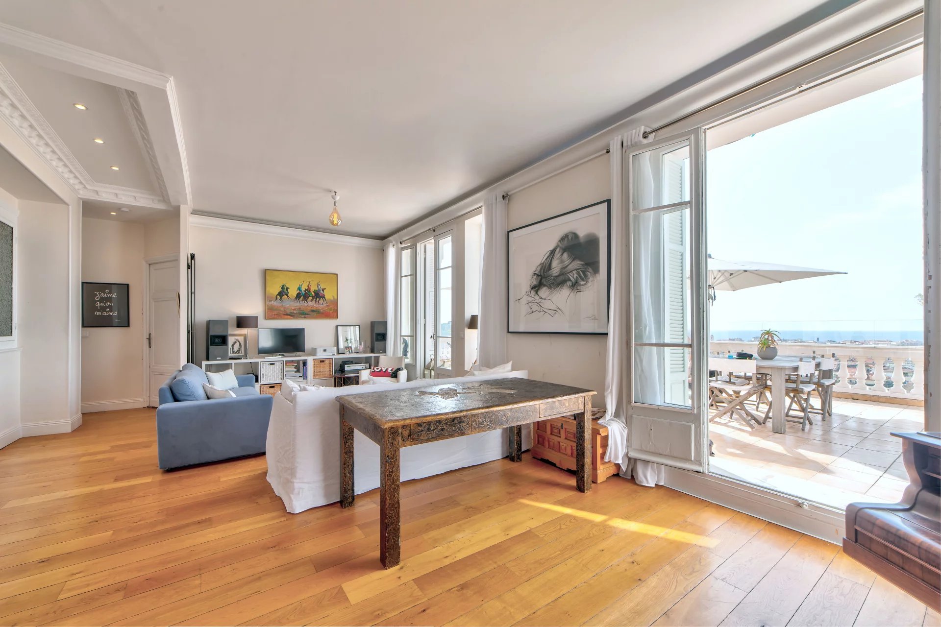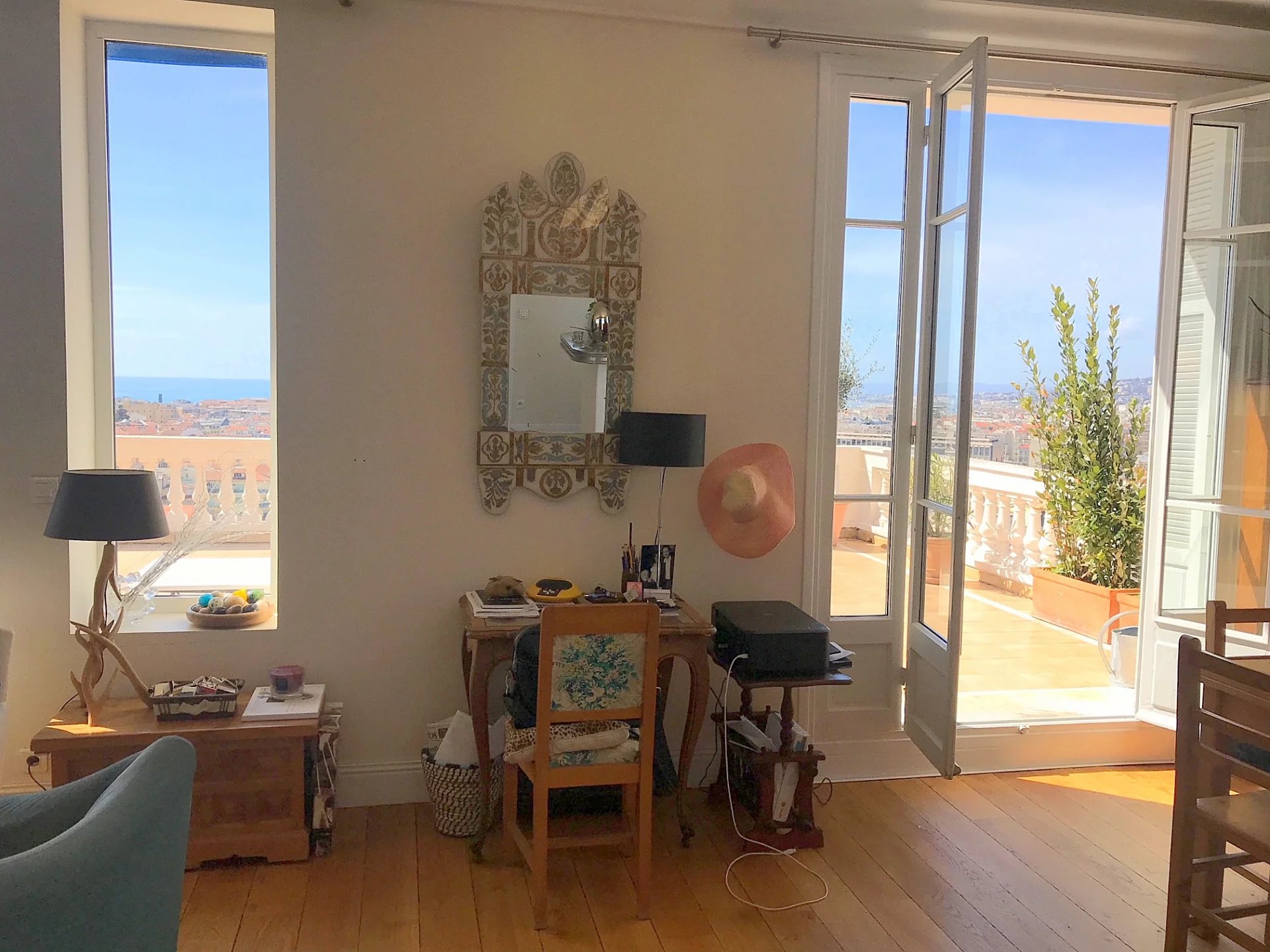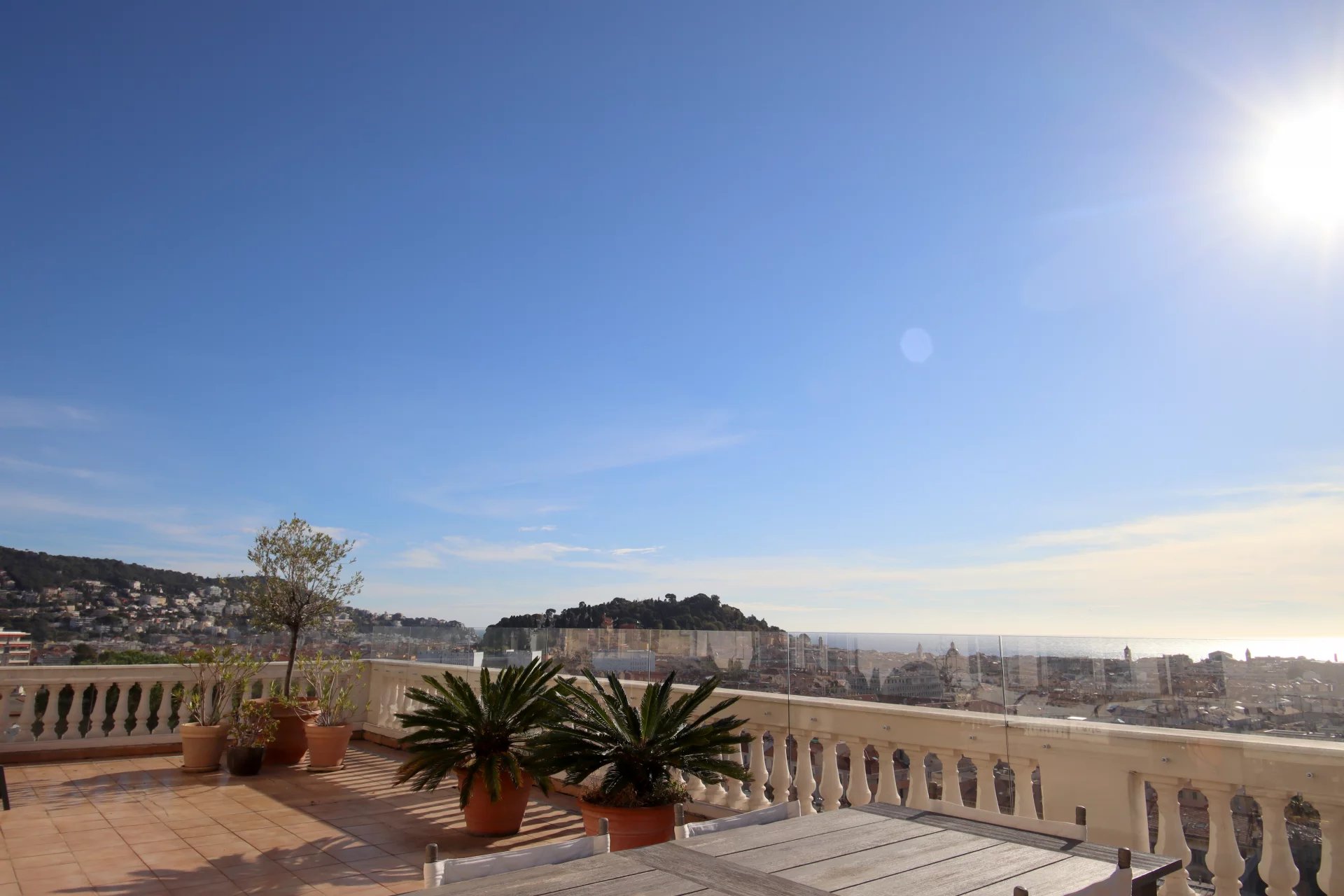 Dans une superbe villa de style " Belle Epoque". Exceptionnel 3 pièces de 97 m² bénéficiant d'une vaste terrasse de 80 m², plein Sud face à une vue spectaculaire ville et mer jusqu'au Cap d'Antibes. L'appartement se compose d'une vaste réception de 50 m² avec cuisine américaine équipée. Une suite parentale avec douche à l'italienne et dressing, une seconde chambre avec sa salle de bains.