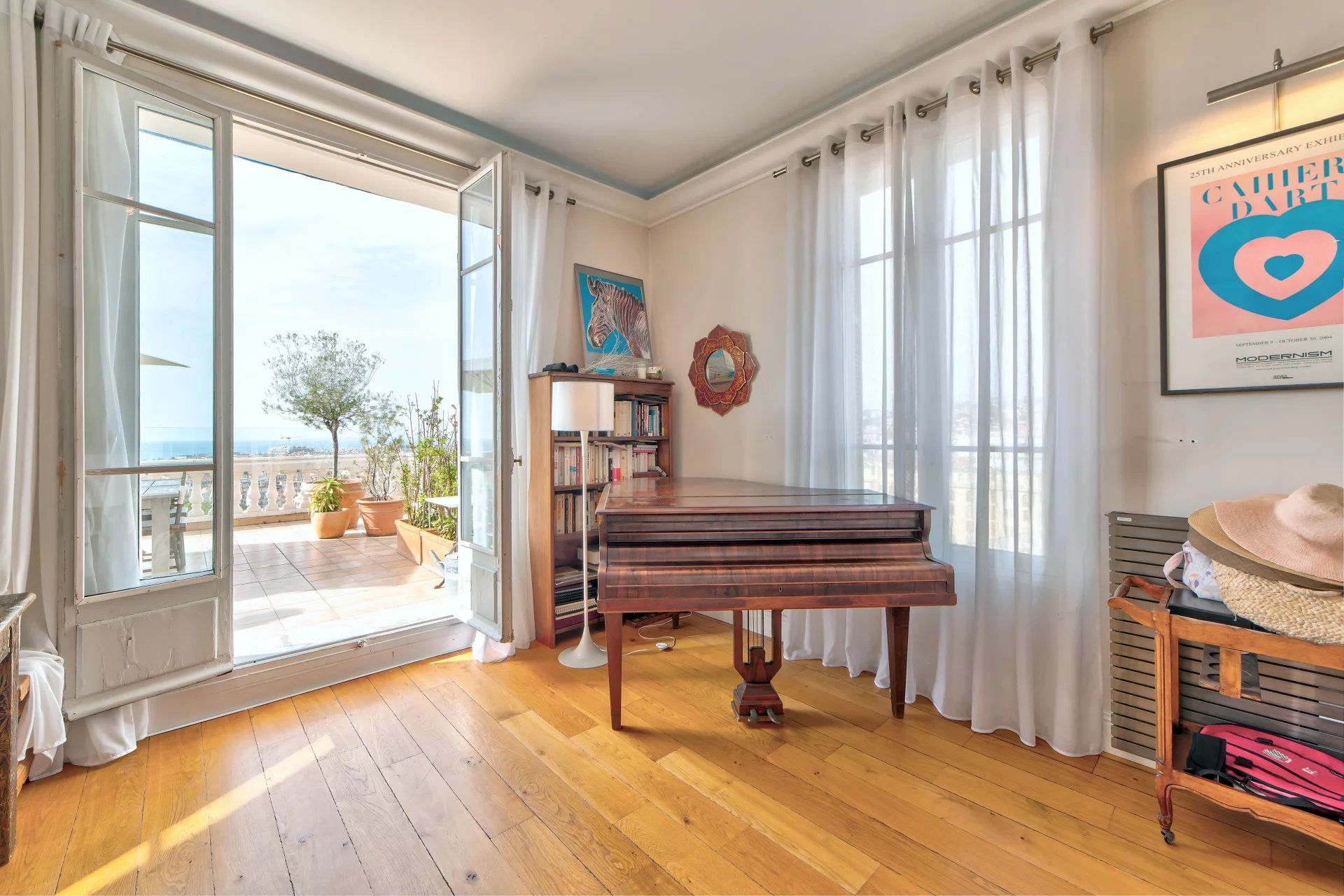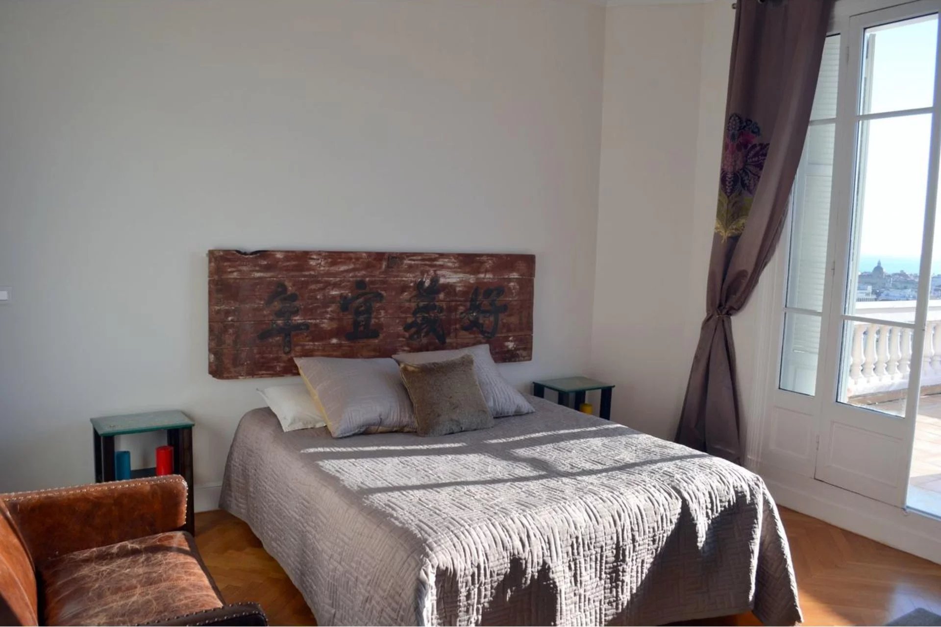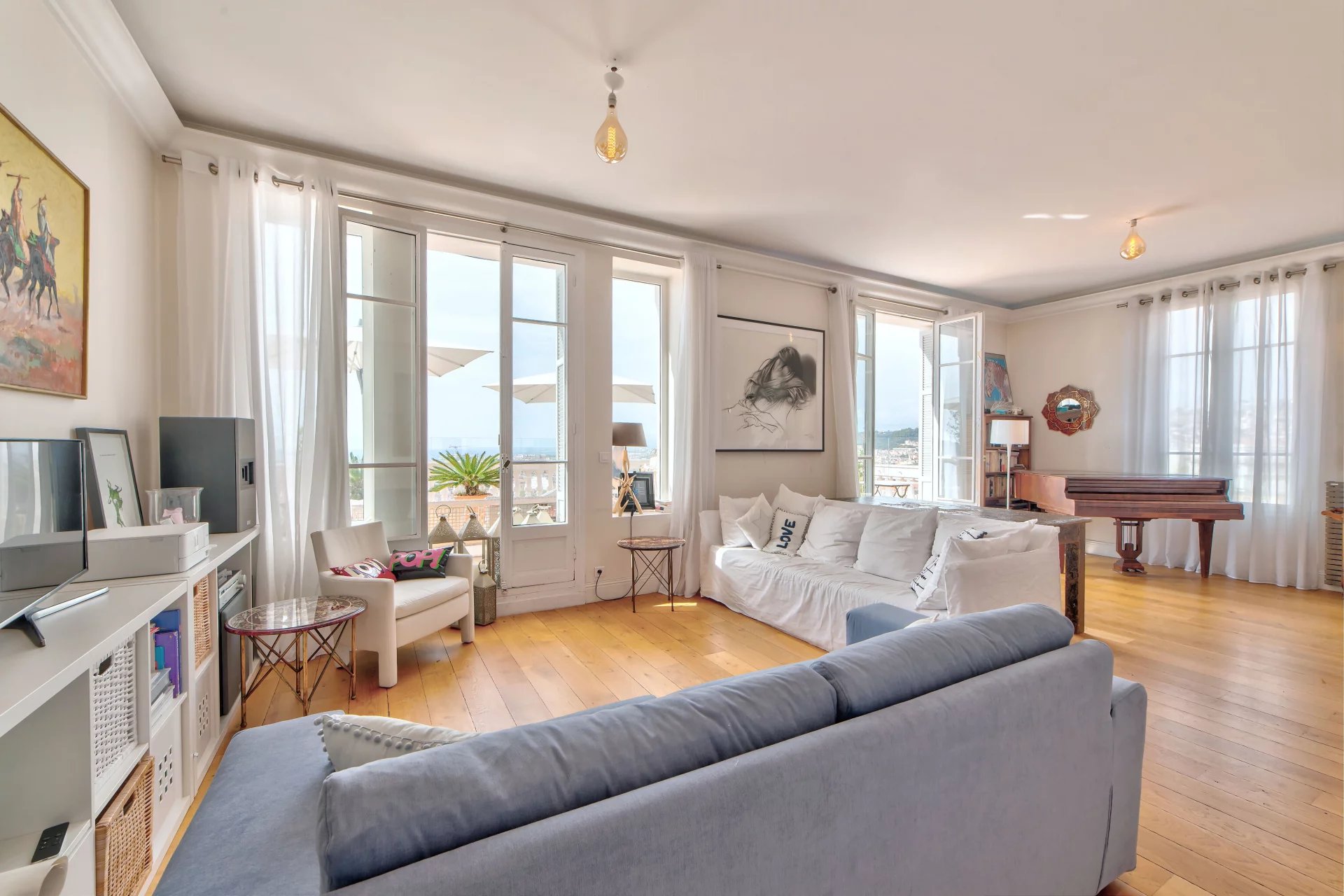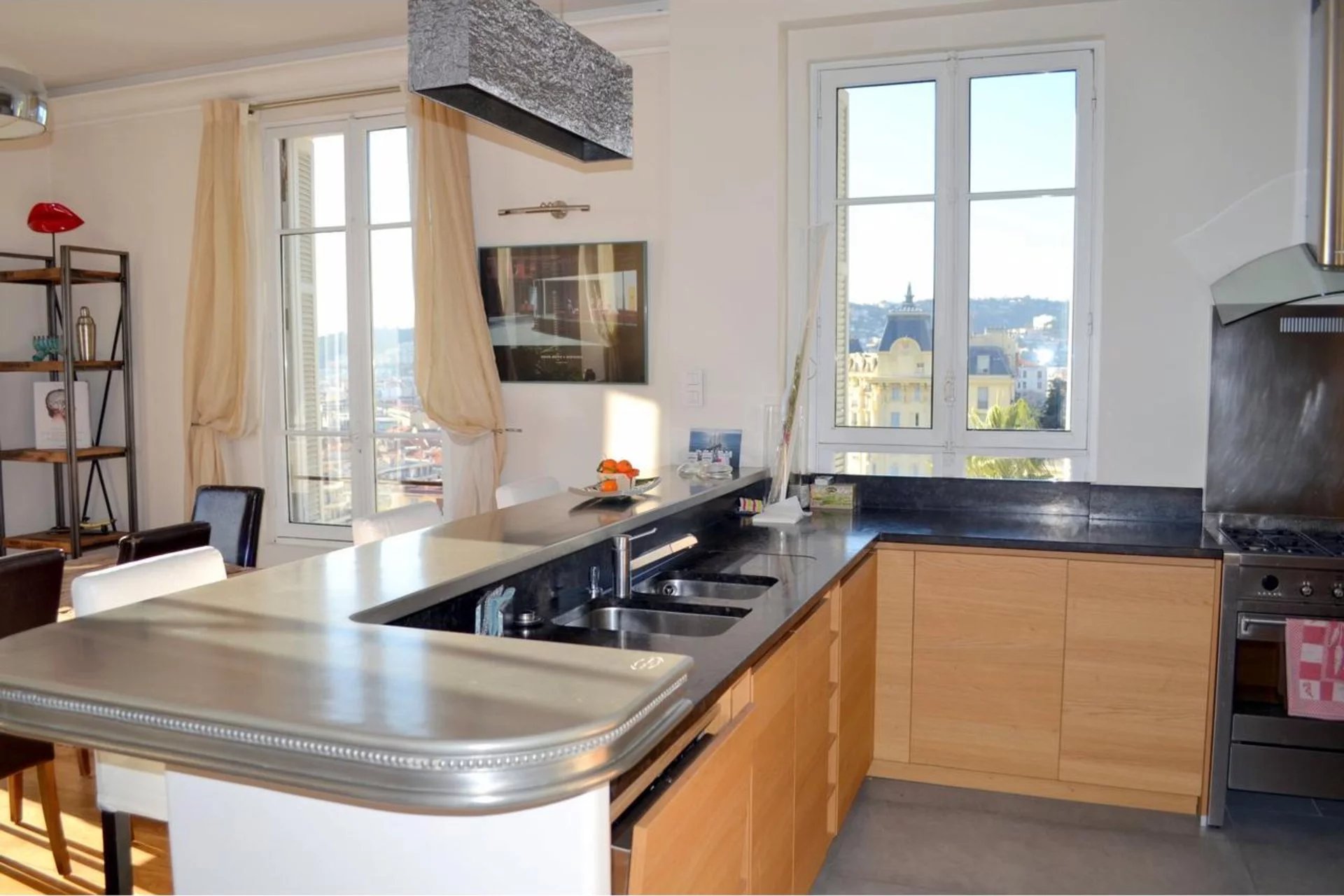 Dans une superbe villa de style " Belle Epoque". Exceptionnel 3 pièces de 97 m² bénéficiant d'une vaste terrasse de 80 m², plein Sud face à une vue spectaculaire ville et mer jusqu'au Cap d'Antibes. L'appartement se compose d'une vaste réception de 50 m² avec cuisine américaine équipée. Une suite parentale avec douche à l'italienne et dressing, une seconde chambre avec sa salle de bains.