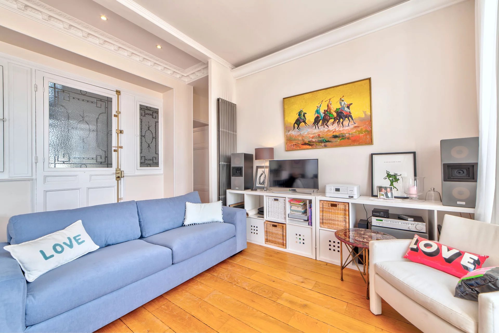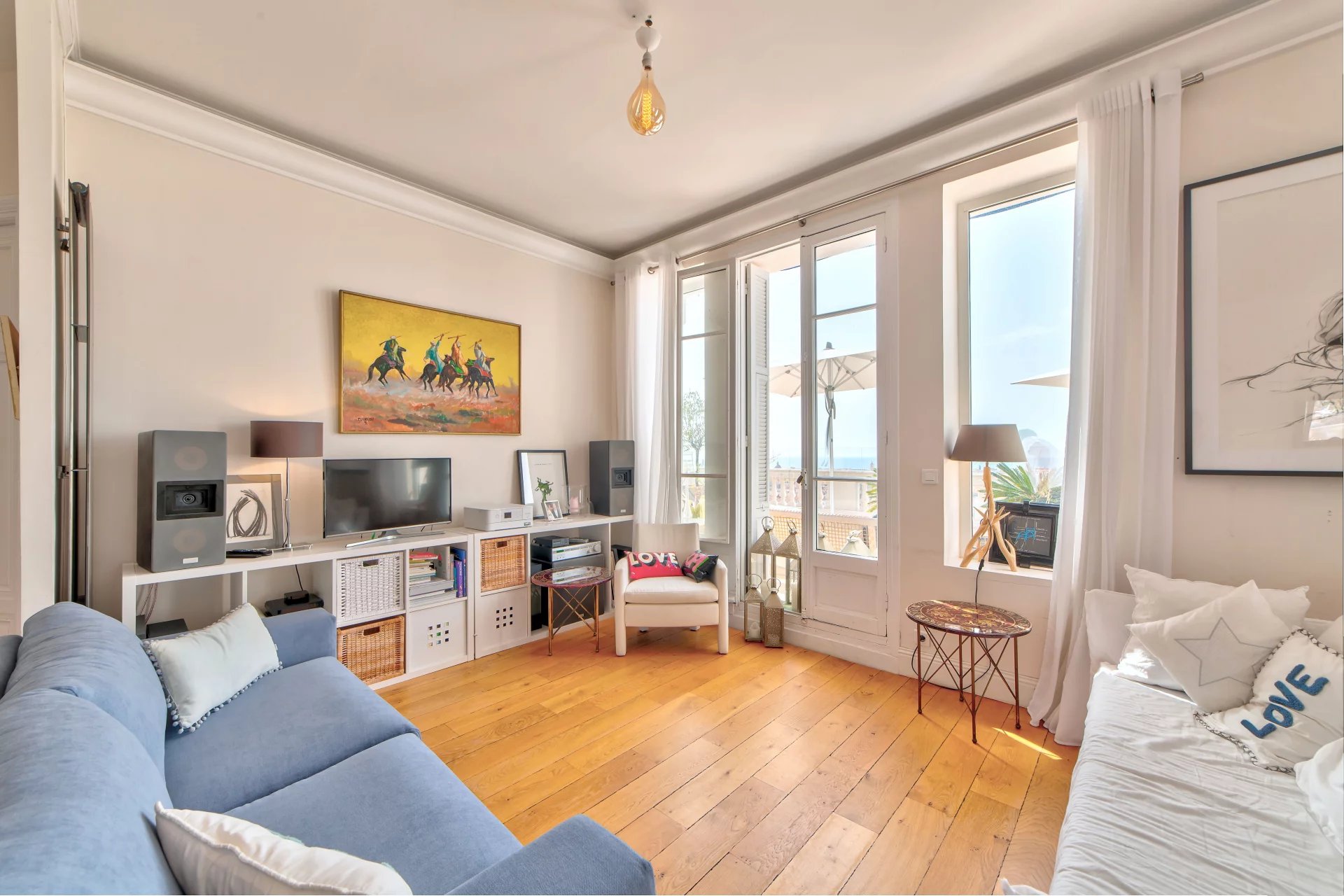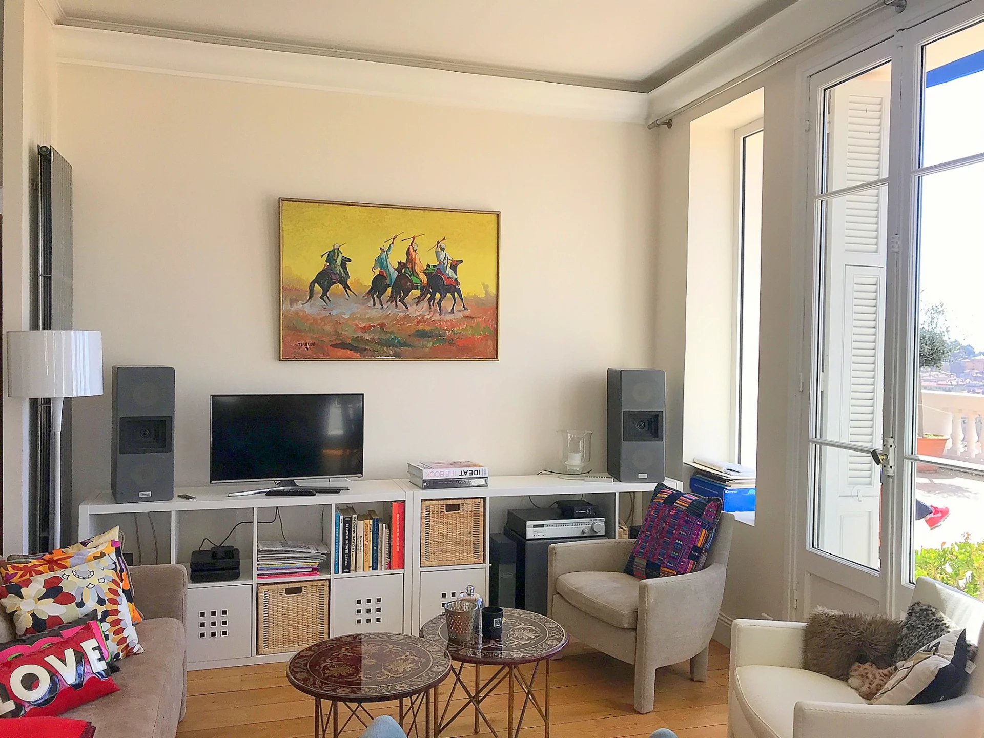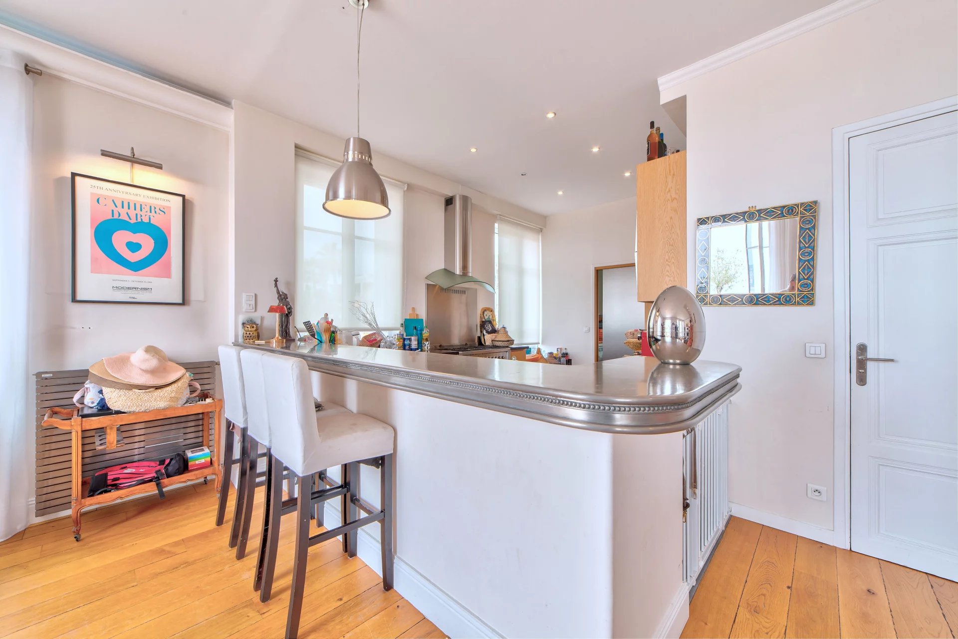 Dans une superbe villa de style " Belle Epoque". Exceptionnel 3 pièces de 97 m² bénéficiant d'une vaste terrasse de 80 m², plein Sud face à une vue spectaculaire ville et mer jusqu'au Cap d'Antibes. L'appartement se compose d'une vaste réception de 50 m² avec cuisine américaine équipée. Une suite parentale avec douche à l'italienne et dressing, une seconde chambre avec sa salle de bains.